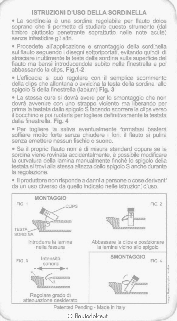 (Resta da aggiungere che è altamente sconsigliato applicare la Sordinella a uno strumento di legno: la frizione prodotta sul labium finirebbe presto col rovinare completamente lo strumento.)
